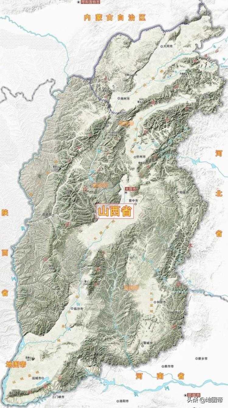 山西省是个山地高原省份,全省基本处在黄土高原的东翼,大部分地区的平均海拔都在1000米以上。在全省面积中,80%是山地和丘陵,剩下的20%多是盆地(含台地)。山西地形一个非常显著的特点,就是盆地较多,而且山西的盆地差不多呈一条线,从北至南狭长分布。另外就是,每一条狭长的盆地基本上都会流经一条大河。