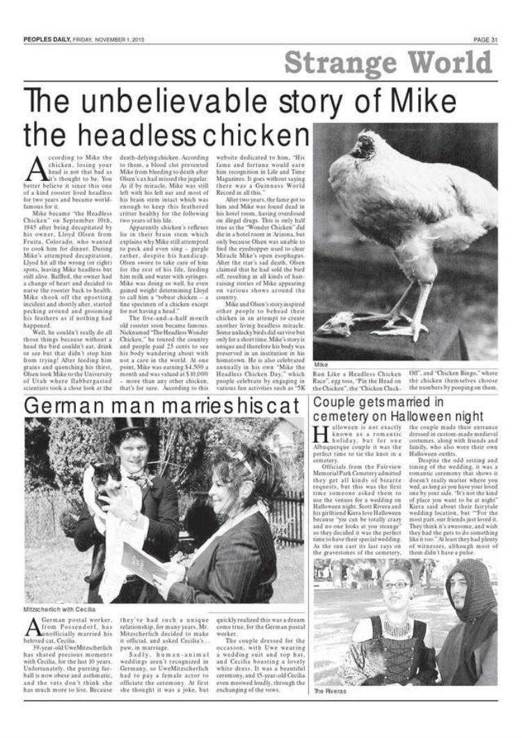 或许正是因为抱着这样的想法,就在他果断的手起刀落之后。令他惊叹不已的事情发生了,这只鸡并没有死。尽管它因为失去头部,依然痛苦万分,反应剧烈,但没过不久,这只公鸡便又可以活动自如。