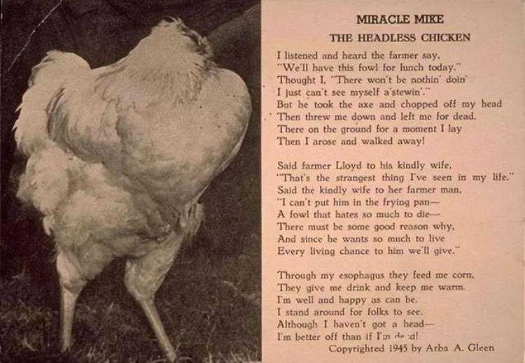 或许你早已为之疑惑不已了?为何这只鸡会没有头?是模仿断臂的维纳斯,认为遗憾之美才最吸引人吗?无头鸡麦克(Mike the Headless Chicken),又被称之为是“奇迹麦克”(Miracle Mike),因为它曾经创造了一个让人难以置信的奇迹。