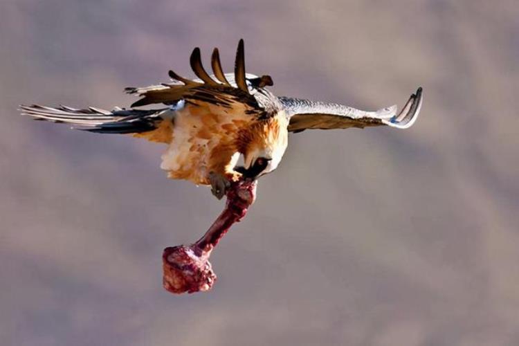 但这种猛禽和其他禽类不一样,它们不爱鲜嫩多汁的肉类,却偏偏钟情于大骨头,所以长有铁钩的脚有所退化,高而侧扁的嘴反而变得格外强大,前端钩曲成90度如同钢钳一般,从高空夹带着呼啸的风声直接扑向目标,就像一枚“空对地”的导弹。