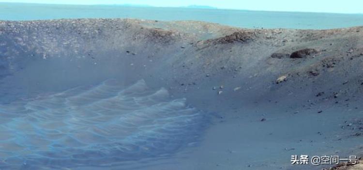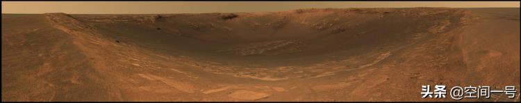成功登陆的机遇号,用了4天时间对自身完成检修,同时还拍摄到了自己的登陆器,也对周边环境拍了个遍。它从着陆点老鹰撞击坑内,拍下了这个直径22米大坑全景图,科学家看到这张照片都非常兴奋,从裸露的岩石可以看出,这里有被液体侵蚀过的痕迹。
