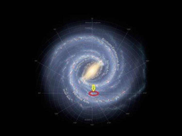 太阳系在银河系中的位置。(NASA/Adler/U. Chicago/Wesleyan/JPL-Caltech)