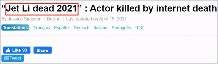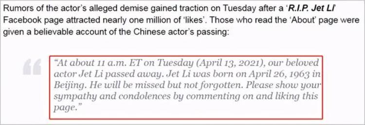 该媒体(网站)于15日发布了一篇有关“Jet Li dead 2021”的文章报道,报道中称“2021年星期二(美国东部时间)上午11点左右,我们心爱的演员李连杰(Jet Li)去世了。李连杰1963年4月26日出生于北京。他将会被遗忘……以表示您的同情和慰问……”