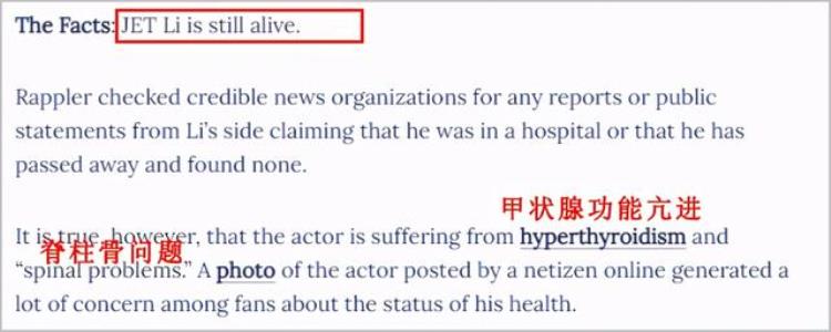 不过,早前有外媒发文辟谣称,李连杰只不过患有“甲状腺功能亢进”以及“脊柱骨问题”的疾病,他好好的并没有去世,仍旧“alive”呢,不过这些辟谣根本不能压制流言的传播。