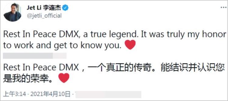 那么李连杰先生的近况如何?他虽然久已未公开在媒体面前露面,也没有在国内社交平台上发声,但是在外网社交平台上,他于近日发了一则动态,彼时因为说唱传奇歌手DMX去世,李连杰感到非常悲伤,因此发布动态哀悼,显然也是顺便为外网谣传自己去世的消息辟了谣。