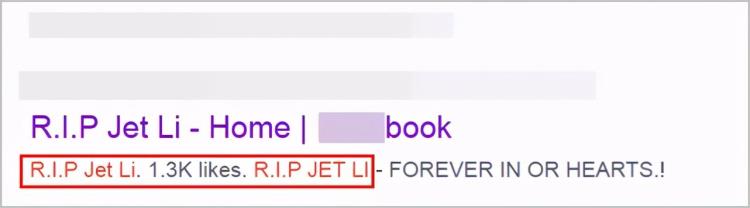 据悉,该媒体表示这些消息是从外网社交平台上获得,在FB网站上有关于“R.I.P. Jet Li”的信息流传,并且已经获得了很多“like”(类似关注、追踪功能),我们搜索了一下,发现确实有“R.I.P. Jet Li”的信息在外网上流传,获得的“like”约为1.3千,由此可见“李连杰去世”的假消息在外网传播的有些厉害。