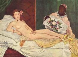 奥林匹亚是古希腊神话中众神聚居之地,画家以此为画名,画了一个躺着的裸女,裸女以深色的轮廓线勾出,她既不丰满,也不漂亮。背景里还画有黑奴和一束鲜花。朦胧晦涩的画面一直引起人们的猜测:作品的主题是什么呢?奥林匹亚之谜一直以来都备受争议,至今都未解。