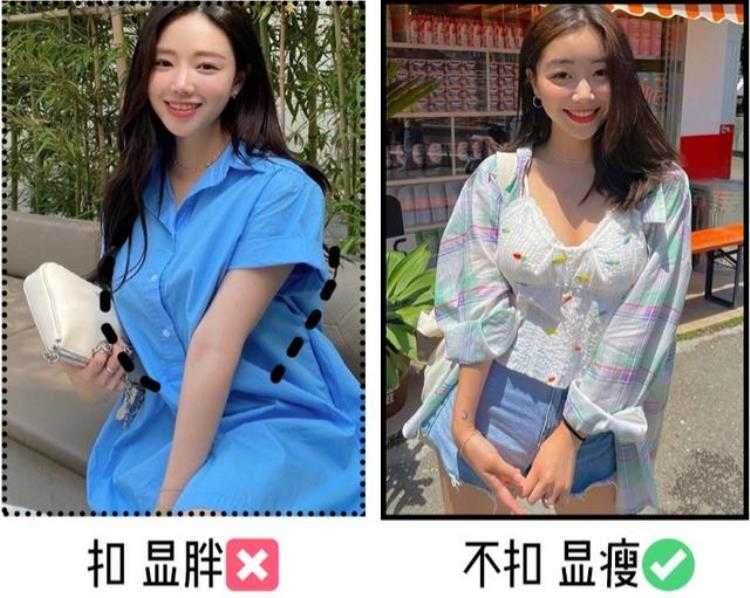 穿上衬衫千万别扣!!一扣上胸前的起伏马上凸显,显胖!从性感美女变壮汉只需2秒。