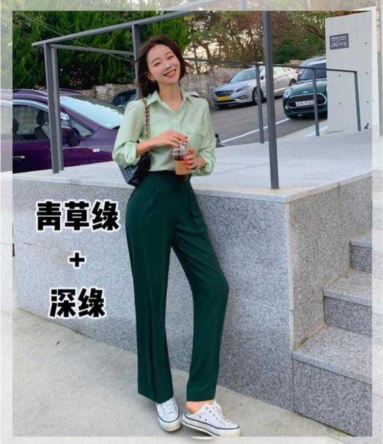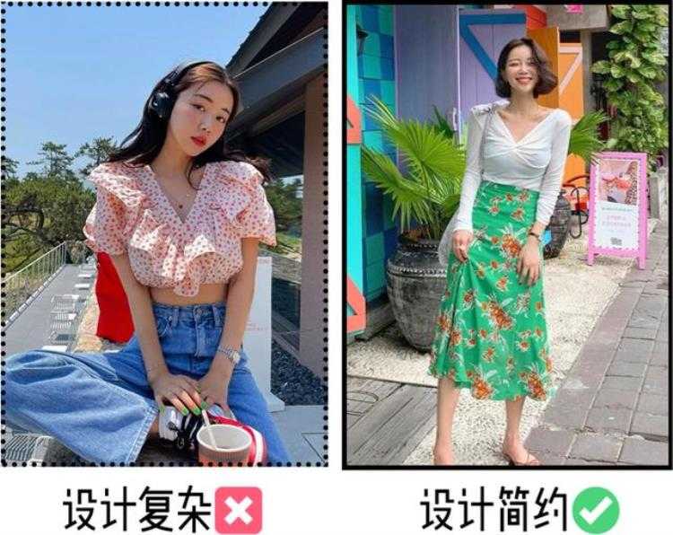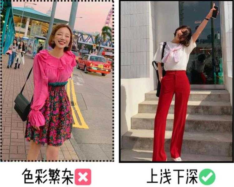 下半身单品的颜色一定要比上半身艳/或是深。深色为主,浅色为辅,这样更能起到视觉转移的作用。