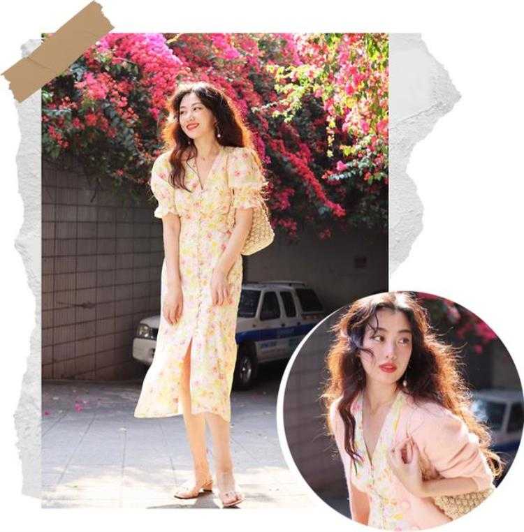 小印花、波点类的图案大胸还是可以穿滴,适当外搭一件小外套当作过渡会更好~