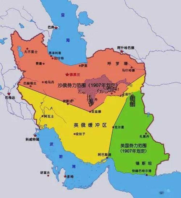 1907年,英俄两个帝国主义国家相互勾结,划分了在伊的势力范围:北部属俄国,南部属英国。