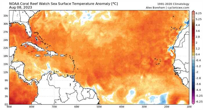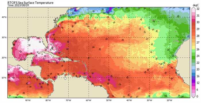 在8月9日的海水温度监测数据上,可以很明显的看到北大西洋热浪滚滚,加勒比海、墨西哥海湾以及北大西洋地区都出现了超过30度的海市温度,尤其是在加勒比海的北部海域,甚至出现了大面积的发白情况,就说明这里的海水温度已经非常高,甚至已经超过了32度的高温警戒。海水温度普遍上涨对于全球来说并不是一个好的情况。