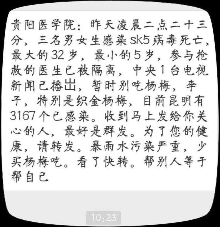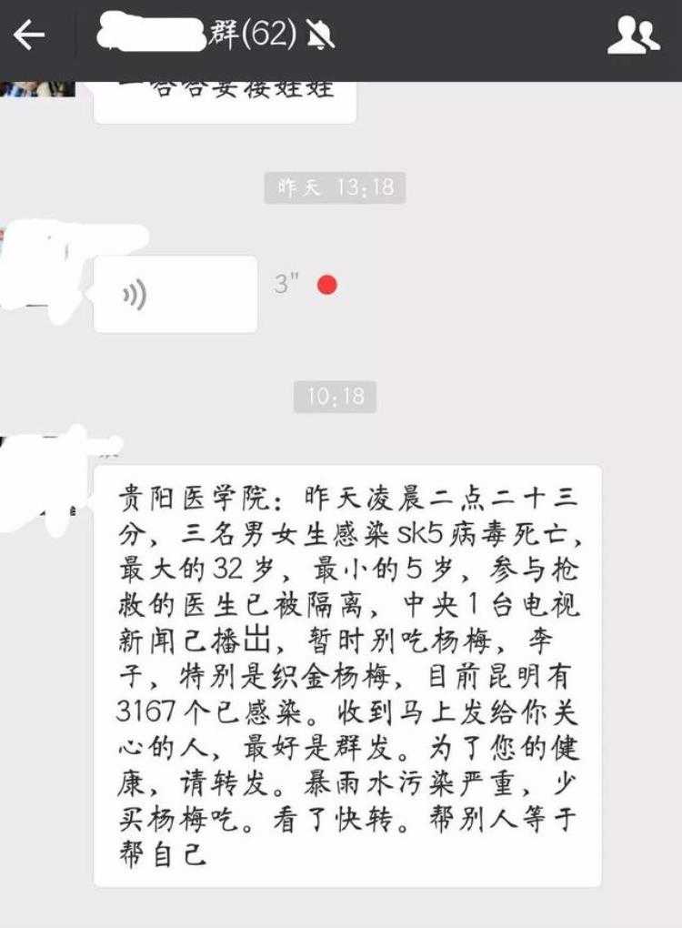 贵阳市疾控中心办公室负责人表示,“sk5病毒入侵”是多年来一直在传的一个谣言,每到这个季节,就会有人发出来。