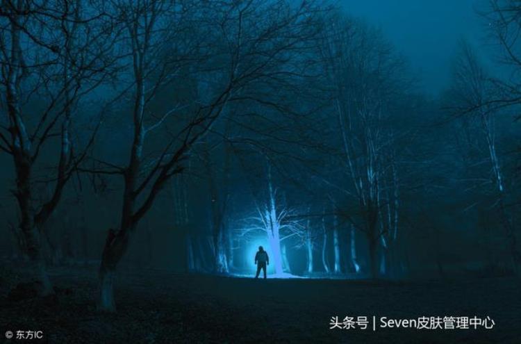 在黑暗的阴森森的森林里,奇怪的剪影在夜晚,神秘的风景梦幻般的灯光和令人毛骨悚然的男人