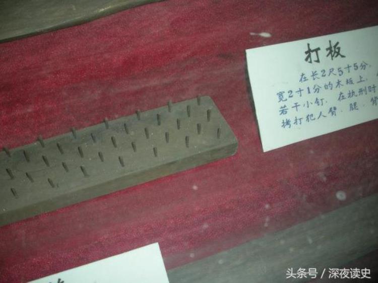 打板,用于拷打犯人的胳膊、臀部、背部等,上面有密密麻麻的钉子,让人不寒而栗。