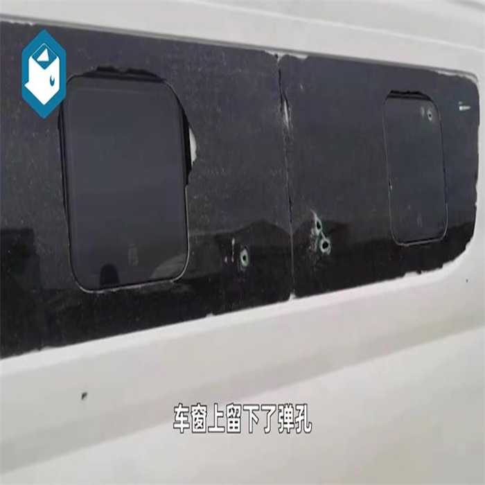 防弹车载着中方人员到达距离瓜达尔警局不远的附近之时,突然遭遇了恐怖分子的袭击,这几辆车中的面包车是恐怖分子袭击的主要焦点,猛烈的射击,让这辆面包车的防弹玻璃,表面上留下了很多的弹痕。