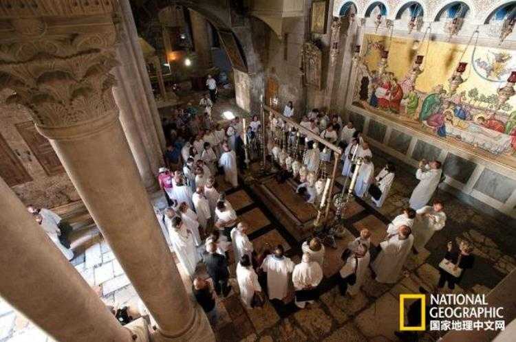 耶路撒冷圣墓教堂的游客们正簇拥在恩膏之石周围,也就是耶稣遗体接受涂油礼的地方。