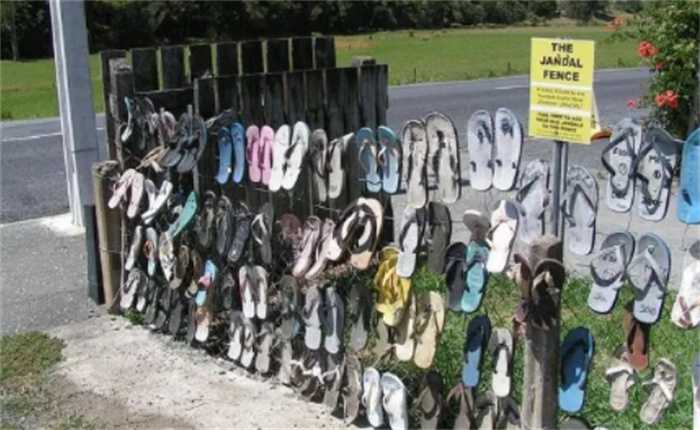 在新西兰,人们喜欢用人字拖鞋来装饰围栏,他们称之为“拖鞋中的三角裤”。尽管最初并没有这种拖鞋产于新西兰,但现在它已经成为新西兰的国家偶像。无论是在城市还是乡村,你都可以看到围栏上挂满了各种各样的人字拖。