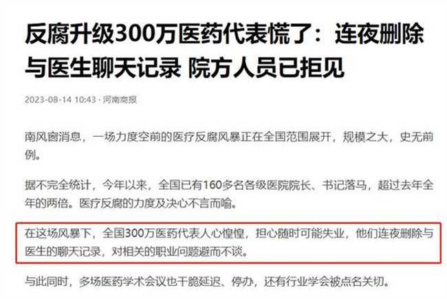 而在这次的反腐风暴当中,全国3,00万医药代表人心惶惶,他们随时都可能面临失业,并且出现了连夜删除与医生的聊天记录,而对于相关职业问题也闭口不谈,与此同时,多场医药学术会也开始推迟停办,同时还有行业学会被点名关切,从8月以来,至少有10场即将举办的医药行业学术会议论坛宣布延期,此外还有一些学习班培训班等也在近日宣布延期举办,而医疗一直以来都是一个高度敏感的领域,所以对于这一领域藏污垢之后,态度必然是高压态势的零容忍的状态。
