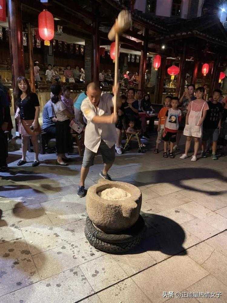 熟糯米饭放到石槽里用石锤捣成泥状,这里可以试吃哦
