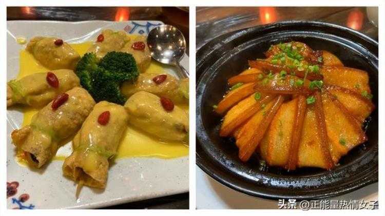 推荐这俩菜,比较有名。第一个是鸡蛋皮中包了菌类菜,第二个是焗五花肉,油炸抽了油,皮有点硬,不过一点都不油腻,很好的下酒菜。