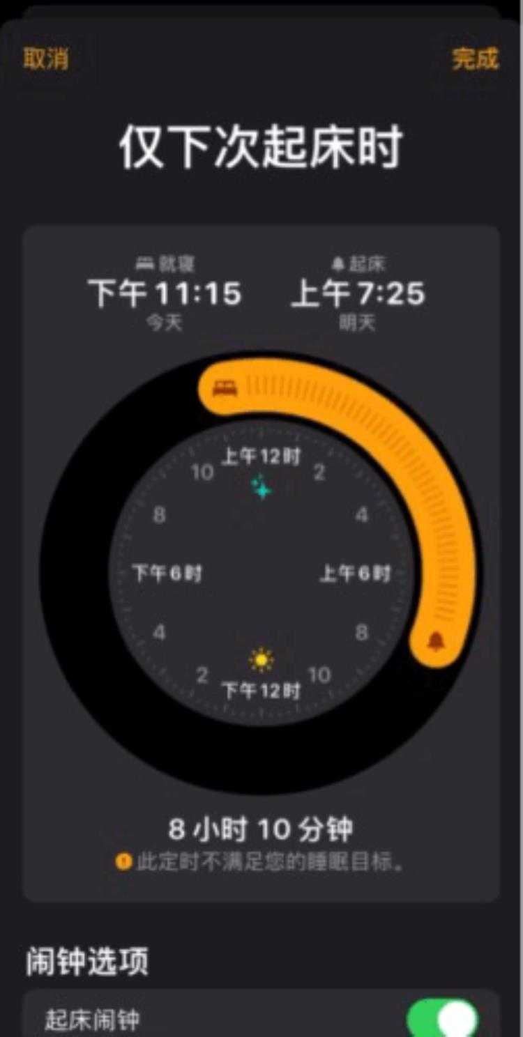 转动转盘,可调整就寝和起床时间(苹果默认用户睡足预设时长,因此就寝和起床时间同步调整)按住转盘末端的“铃铛”标志,可以自定义睡眠时长(在睡眠时长达不到预设时长时,转盘会变成黄色)但此时所有的操作,都只是临时的,因为上方有着硕大的标注——“仅下次起床时”。