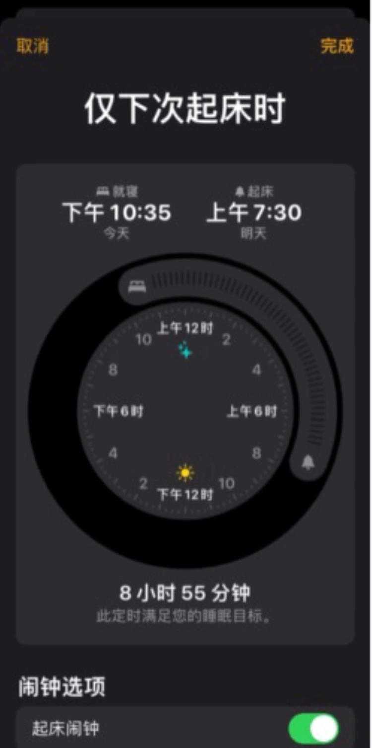 好在这种设置一劳永逸,今后再要更改时,多半是需要第二天临时调整,因此苹果在一开始就提供了“仅下次调整”的大转盘。