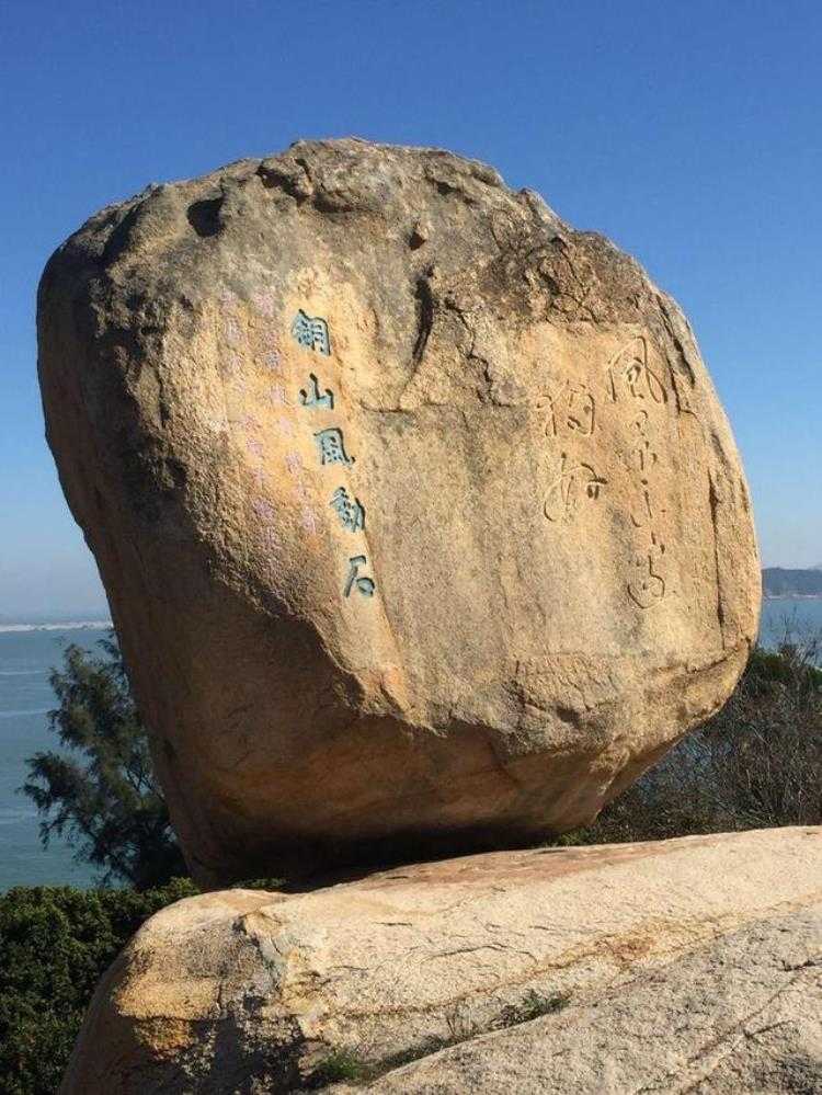 事实上,石佛山的风动石也并非最传奇的石头,同种类型的风动石还要属福建东山岛海滨上的那块石头更为知名。东山岛风动石高度约为4.7米,宽4.57米,长度也接近4.7米重量更是高达200吨,差不多是石佛山风动石的7倍,最重要的是这块石头几百年来一直耸立东山岛悬崖边的峭壁上,呈现一种倾斜的磨盘状态,对着大海岿然不动,经过几百年的风吹雨打和数不尽自然灾害,即便是在7.5级地震面前依旧稳定的不像话,可在外力无法介入的时候,东山风动石也会在特殊情况下随风大幅度摆动,在当地形成了一个奇特的景象,也是当地著名景点。
