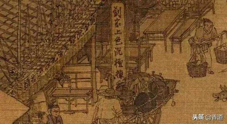 由于宋代海外贸易兴盛,人们很轻易的就能取得来自诸国的各种香药。在张择端的《清明上河图》中绘有一家香药铺——“刘家上色沉檀拣香铺”。