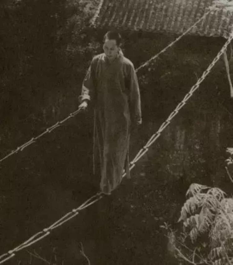 30年代,四川江油窦图山上的寺庙,僧侣以简易的铁索为桥,踏索越堑。下面虽是凌空万丈,而照片中的僧侣却神色若定,步伐稳健,仿佛旧时小说所称的武林中人。僧人们离群索居,孤山一隅潜心修行,或有修得独门秘术,以待他日出山替天行道也。