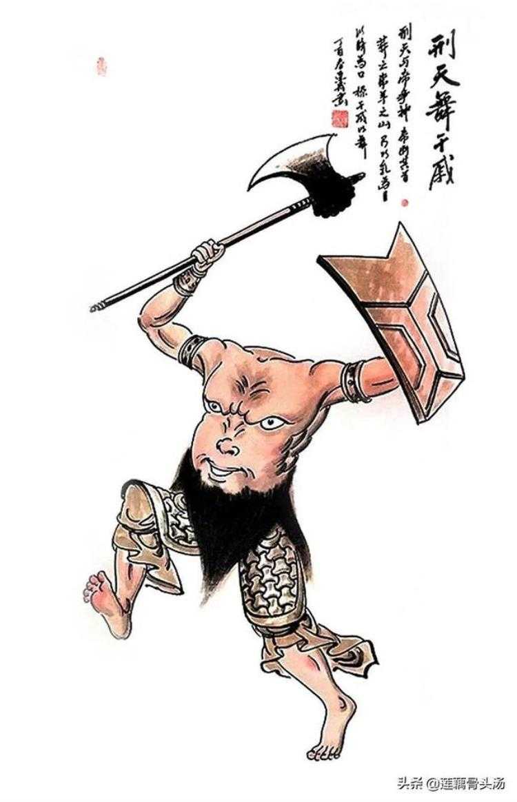 据《山海经·海外西经》记载,刑天和黄帝(一说天帝)争位,被斩去头颅,失了首级后,以自身双乳作眼、肚脐为嘴的形态存活,双手各持一柄利斧和一面盾牌作战。