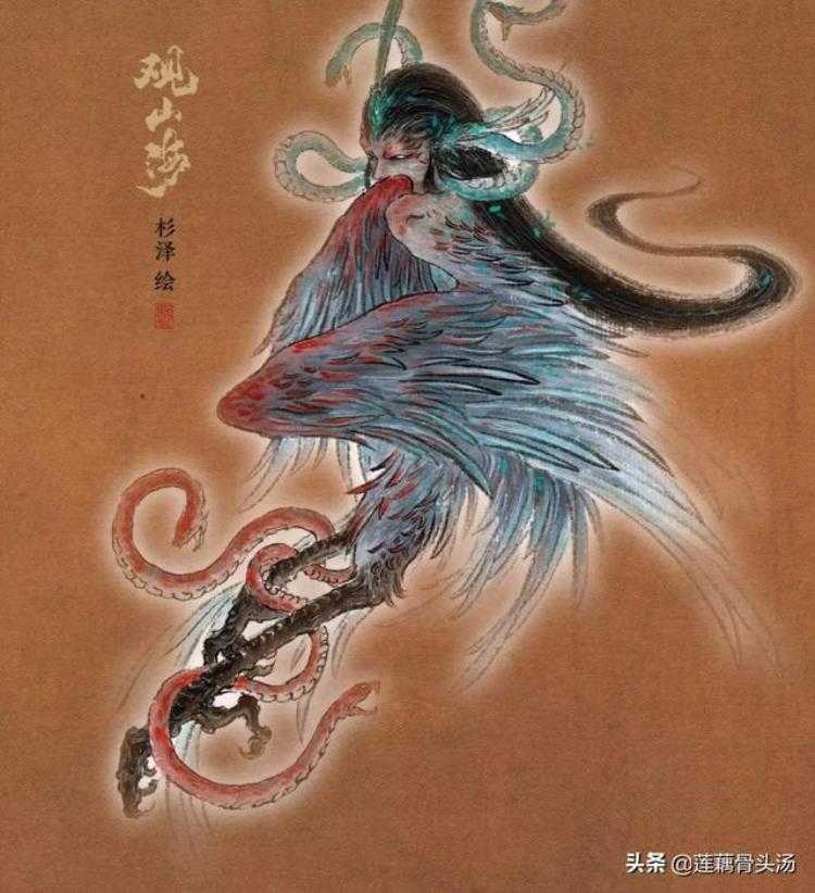 出自《山海经》。 在《山海经》中,描绘了大量“人首蛇身”的上古大神,比如我们所熟知的伏羲、女娲、共工等等,都是以“人首蛇身”这种奇特的身体构造出现的。自古以来,我们中国的远古神话传说中的“神”或是“神人”等为人们所崇敬的、比较有社会影响力的神话传说中人物其形象大抵都为“人兽蛇身”。 “人首蛇身”是远古人们从进化论的角度,将人、神、兽的结合,这里面所体现的是人们对于人的神化的寄寓。 人、兽、神的结合是人们对于神性向的理性转变。其中“人面蛇身”形象的形成和演变过程便是原始古人们最好的精神体现。