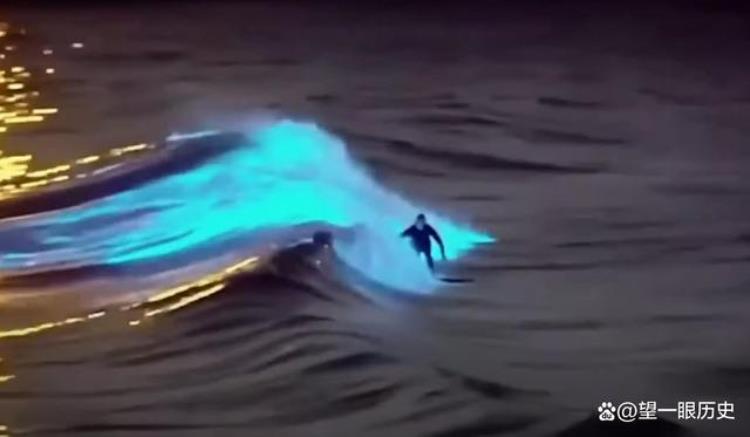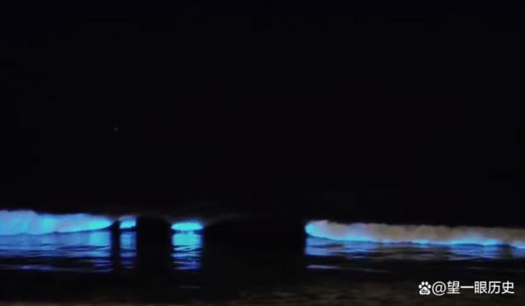 这些发光的海浪是由水中的藻类生物发光引起的,这种现象只有在晚上才能看到。