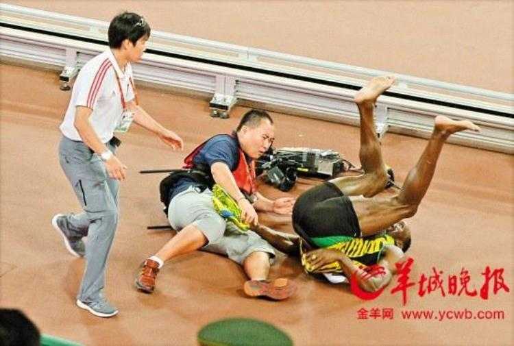 昨晚,正在鸟巢赤脚庆祝夺得双冠的博尔特,遭遇了一场离奇“车祸”——被一位摄像小哥的两轮小车从背后直接“铲”倒,幸亏没有受伤的牙买加飞人事后开玩笑:“一定是加特林雇人来撞我的!”