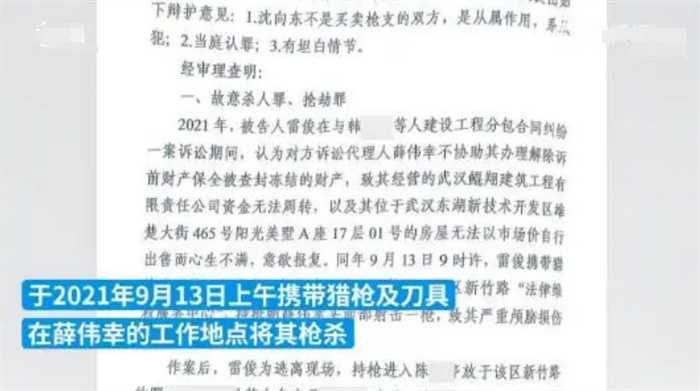 8月20日消息,于2021年9月13日发生的武汉律师枪击案件在今日正式作出一审判决,被告人雷俊因犯有故意杀人罪,抢劫罪,运输枪支罪和非法买卖罪被判处死刑,同时本案其他四名涉嫌非法买卖枪支的嫌疑人被判入狱。根据一审判决书的裁定内容显示,由于自己在民事诉讼中的财产被冻结查封,导致被告人雷俊对原告代理律师薛伟幸心生不满,在2021年9月13日,携带猎枪和管制刀具闯入薛伟幸所在的工作室将其残忍的杀害。