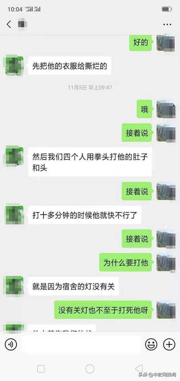 张先生保存下来的时间显示为2019年11月2日晚到11月6日期间的聊天记录显示,对方断断续续讲述了他们殴打小迪的原因和经过:“我想告诉你小迪的死,我说了你不能报警。”“晚上宿舍的灯没关,让他(小迪)关他不关。”“先把他骗到洗手间,然后打他的肚子和头。”“先把他的衣服撕烂的。”“然后我们四个人用拳头打他的肚子和头。”“打十几分钟的时候他就快不行了。”