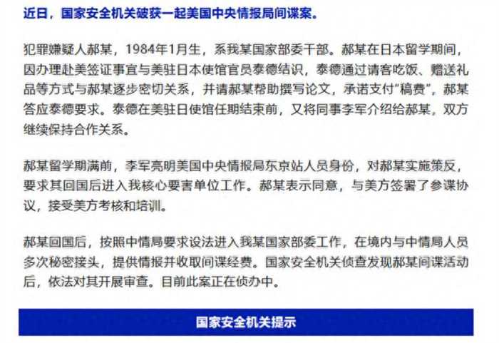 在郝某留学期间结束之后,李军突然对其亮明自己是美国中央情报局人员的身份,随即就展开对郝某的策反行动,在李军的长时间撤访之下,郝某也是同意在回国之后进入到核心要害单位进行工作并去盗窃内部信息,郝某在与对方签署参谍协议之后就长时间接受美方的培训以及考核,最后在郝某回国之后直接进入到我国国家部委工作局当中工作,在工作期间也经常会与美国中情局的人员接头,甚至还提供一些内部数据来获得经费。