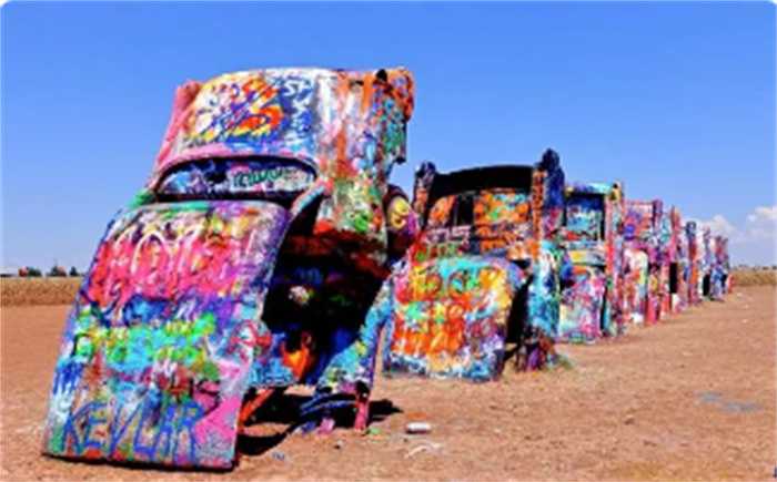 在德克萨斯州的阿马里洛,有一组10辆涂鸦色彩的凯迪拉克被埋在沙丘中。这是一个引人疑惑和奇特的景象,尤其对于路过凯迪拉克农场公共艺术设施的人来说。在1974年,三位艺术家创建了这个装置,最初这些凯迪拉克被安置在麦田中,但在1997年被重新布置,以适应不断扩张的城市。虽然凯迪拉克农场位于私人土地上,但游客被鼓励前来参观,并可以在涂鸦的同时与这些凯迪拉克互动。