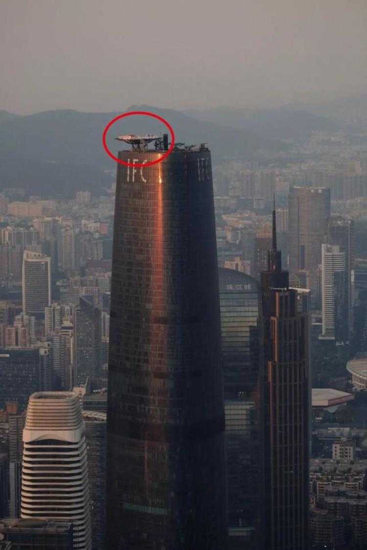无人机持续向上,IFC高耸入云,车子则静静地矗立在停机坪上。