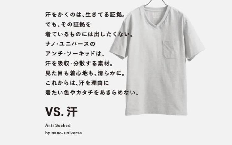 Anti Soaked 就是上文提到过的 nano·universe 独创的面料技术,它本质上是类似于 DWR 的面料涂层技术,可以吸收汗水(不容易留下汗污),还可以吸收一定的热量和紫外线,让各位可以在炎炎夏日保持清爽。