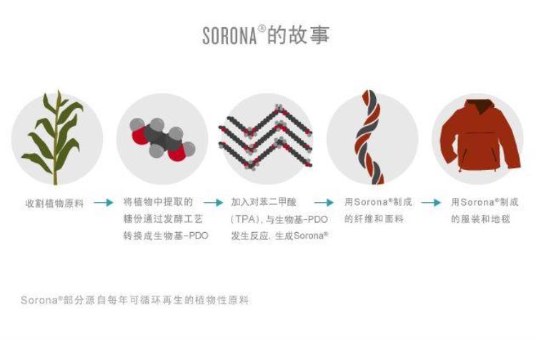 Sorona 是杜邦公司最近冉冉升起的一种纤维,不同于大部分化纤来源于石油提取物,Sorona 源自玉米,是一种可再生的生物基纤维。杜邦公司和伙伴企业 Tate & Lyle 将玉米进行湿磨加工转换成葡萄糖,再经过一系列发酵和化学反应,最终形成 Sorona 纤维。