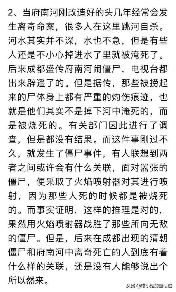 据说府南河刚改造好的头几年很多人跳河自杀,河水也并不深,水也不急,但是有些人不小心掉进水了里就被淹死了。后来成都盛传府南河闹僵尸,电视台都出来辟遥了的。