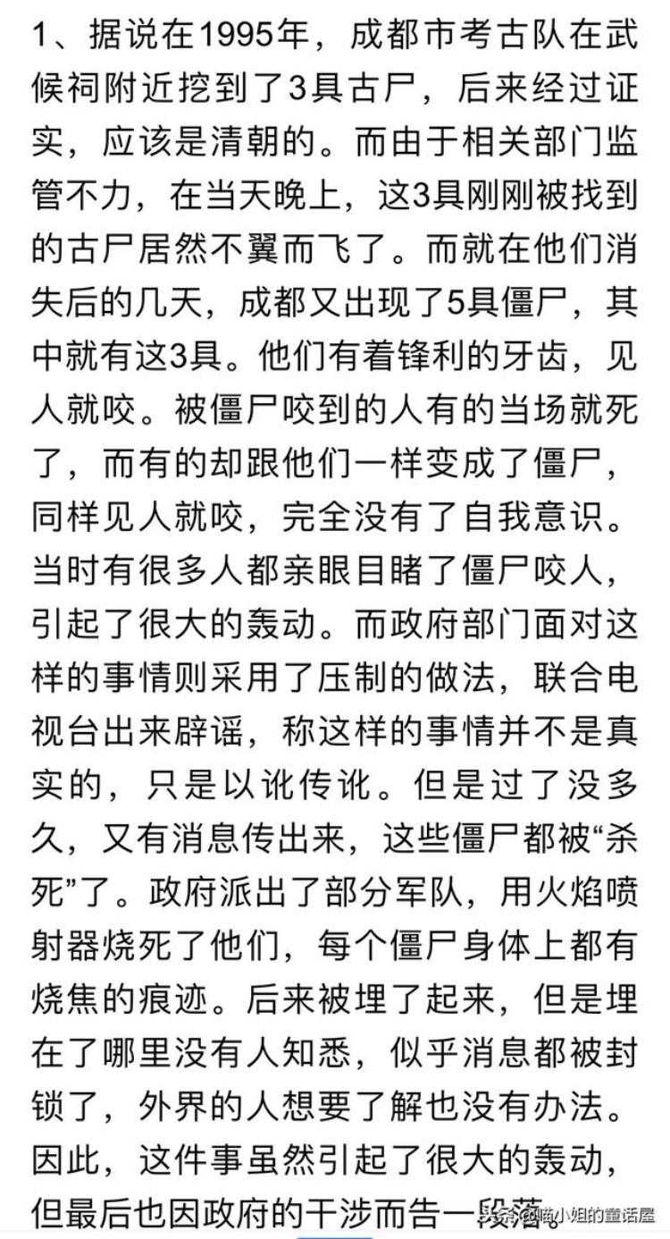 时间大概是1995年,,有一天流传这么一个故事: 成都市考古队在武候祠附近挖到3具古尸,清朝的.由于监管出了点差错,一夜之间3具古尸不翼而飞!!后来又出现了5具僵尸,专咬人头,没咬死的就变僵尸.最后是出动解放军,用火焰喷射器烧死的.