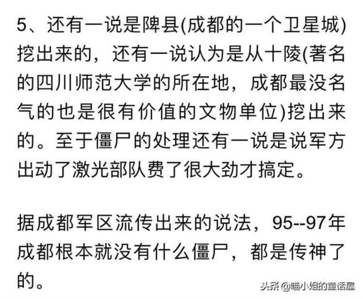 3、还有一说是陴县(成都的一个卫星城)挖出来的,还有一说认为是从十陵(著名的四川师范大学的所在地,成都最没名气的也是很有价值的文物单位)挖出来的。至于僵尸的处理还有一说是说军方出动了激光部队费了很大劲,挂了很多人才搞定的。
