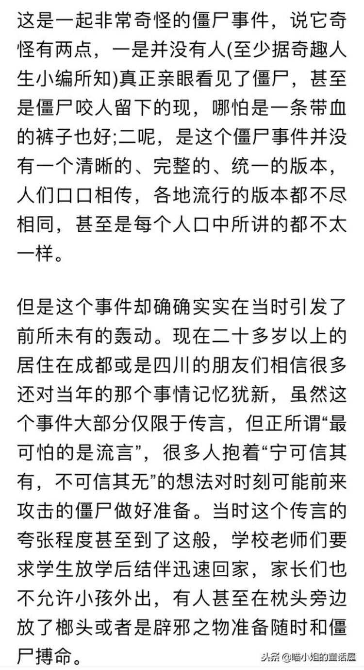 不过调查不出什么也只好不了了之了,僵尸这个事呢,是轰动咯全四川的。当时我在读5年级,好吓人。据说僵尸还扮成人样子……坐火车到处跑..看到你觉得合胃口就咬你。我每天放学就怕遇到这种事了!