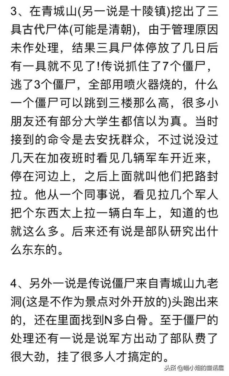 至于僵尸的处理还有一说是说军方出动了激光部队费了很大劲,挂了很多 人才搞定的 说啥子在青城山(另一说是十陵镇)挖出了三具古代尸体(可能是清朝),由于管理原因未作处理,结果三具尸体停放了几日后有一具就不见鸟! 传说公安局抓住了7个僵尸,逃了3个僵尸,全部用喷火器烧的,什么一个僵尸可以跳到三楼那么高,很多小朋友还有部分大学生都信以为真。 当时接到的命令是去安抚群众,不过说没过几天在加夜班时看见几辆军车开近来,停在河边上,之后上面就叫他们把路封拉。他从一个同事说,看见拉几个军人把个东西抬上拉一辆白车上,知道的也就这么多。后来还有说是部队研究出拉差错什么东东的。