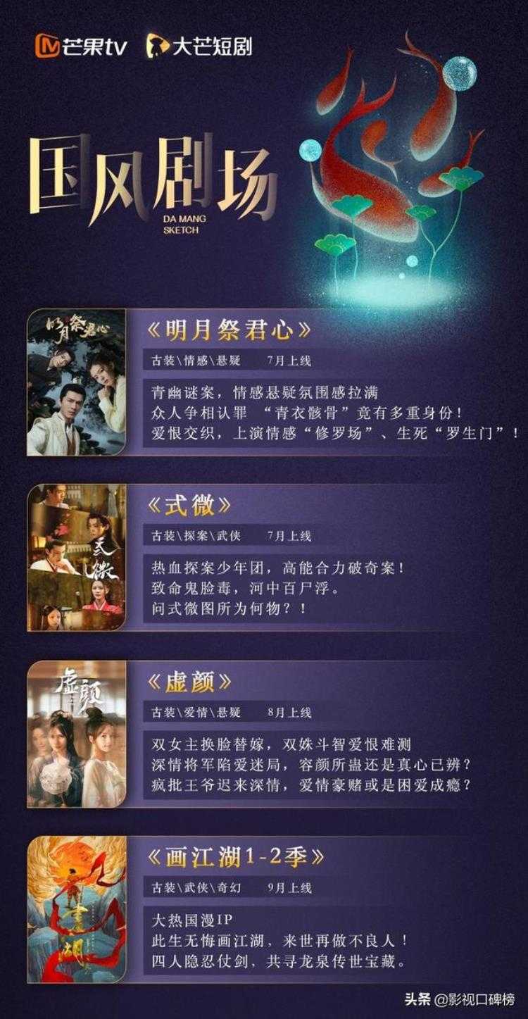 国风剧场中,《明月祭君心》、《式微》、《虚颜》、《画江湖1-2季》四部短剧在列,这四部短剧将陆续在芒果TV开播,以悬疑、探案、玄幻风格为主,国风剧场的古装短剧,也是这个夏天一道独特的风景。