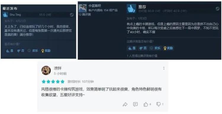 无论是在Steam还是在TapTap,玩家的好评总离不开“上瘾”、“上头”和“爽”这些关键词,甚至有玩家直言“太上头,虽然很菜,基本没有通关过,但是每张图第一次通关后那感觉是真的爽!”,也有玩家精辟地点出了这款游戏的“爽点”所在:“风格很棒的卡牌构筑游戏,效果简单明了玩起来很爽,角色特色鲜明很有收集欲望”。