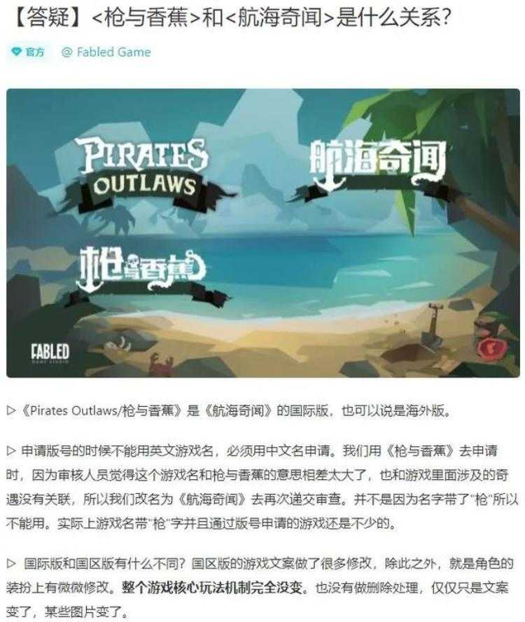 在TapTap上,官方也对此进行了一番说明,由于申请国服版号时审核人员认为“枪与香蕉”的本意与游戏内容意思相差太大,所以最终国服改名为《航海奇闻》,游戏的核心玩法没有任何删改,完整继承了原作,因而不会影响到玩家的游戏体验。
