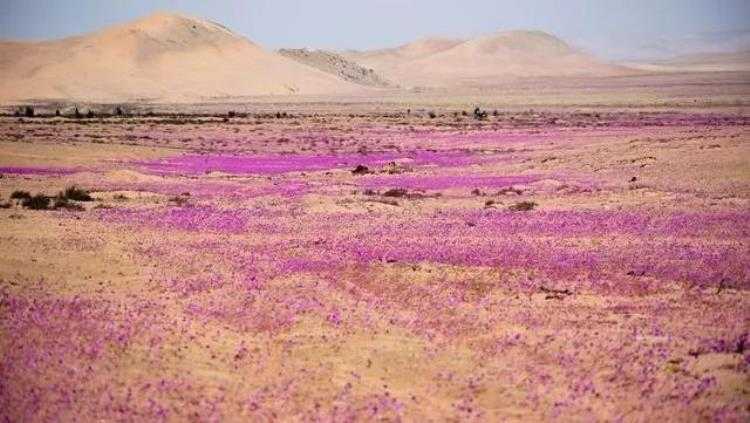 旱灾的阿塔卡马沙漠坐落于智力北边,在一场大雨过后,居然不可思议地变成了被漂亮且充满活力的花瓣遮盖的地区。一般,降水引起的荒漠盛开的状况,每5到7年便会产生一次。掩埋在地下的种籽能够出芽并盛开,有200多种多样绿色植物被发现在该地域生长发育,不但花瓣和绿色植物会出现在这里片荒漠,蛇蜥、飞禽,乃至像小狐狸这种小动物都共享资源着这一片土地。